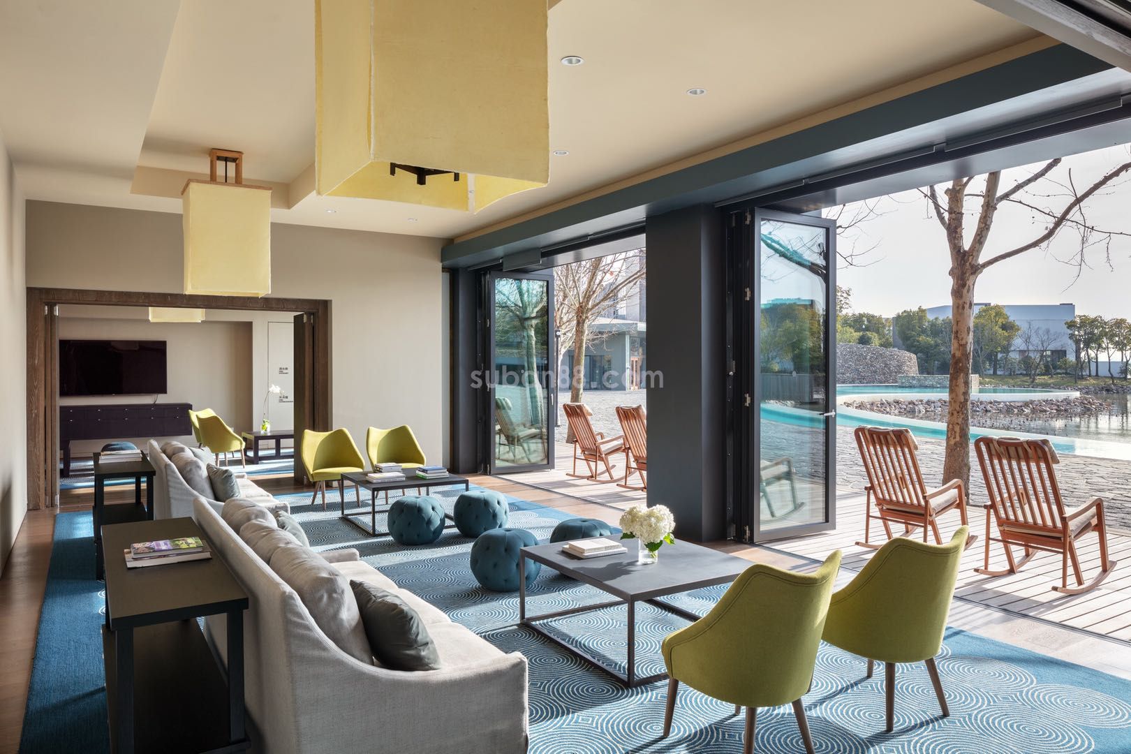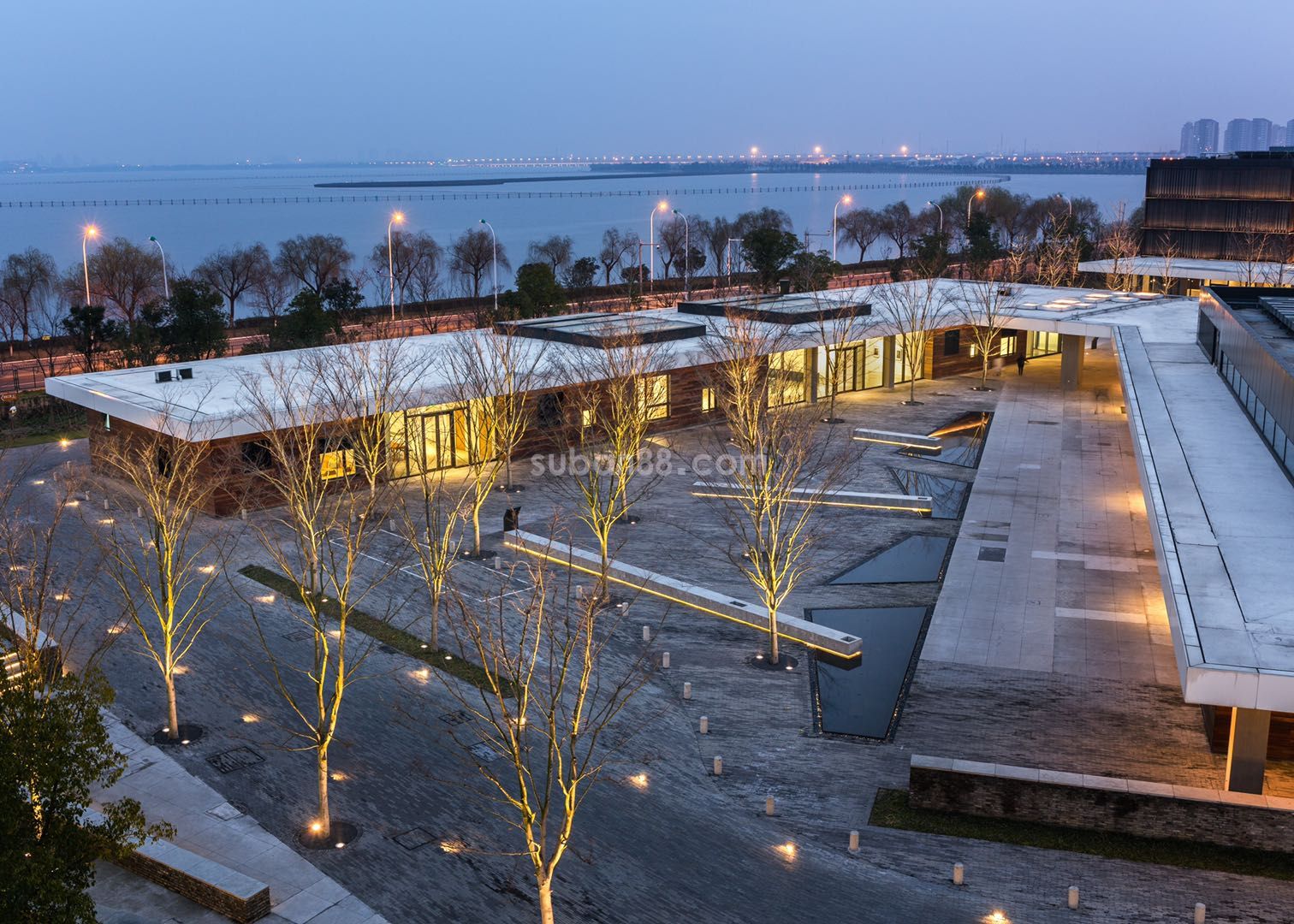 木格柵欄:針對蘇州地區夏季陽光輻射強,使用木格柵,不但可以遮陽,對于室內制冷也有顯著節能效果。用流水將石子細細打磨,與建筑的紋路和諧統一,讓視覺的變化充滿韻律感